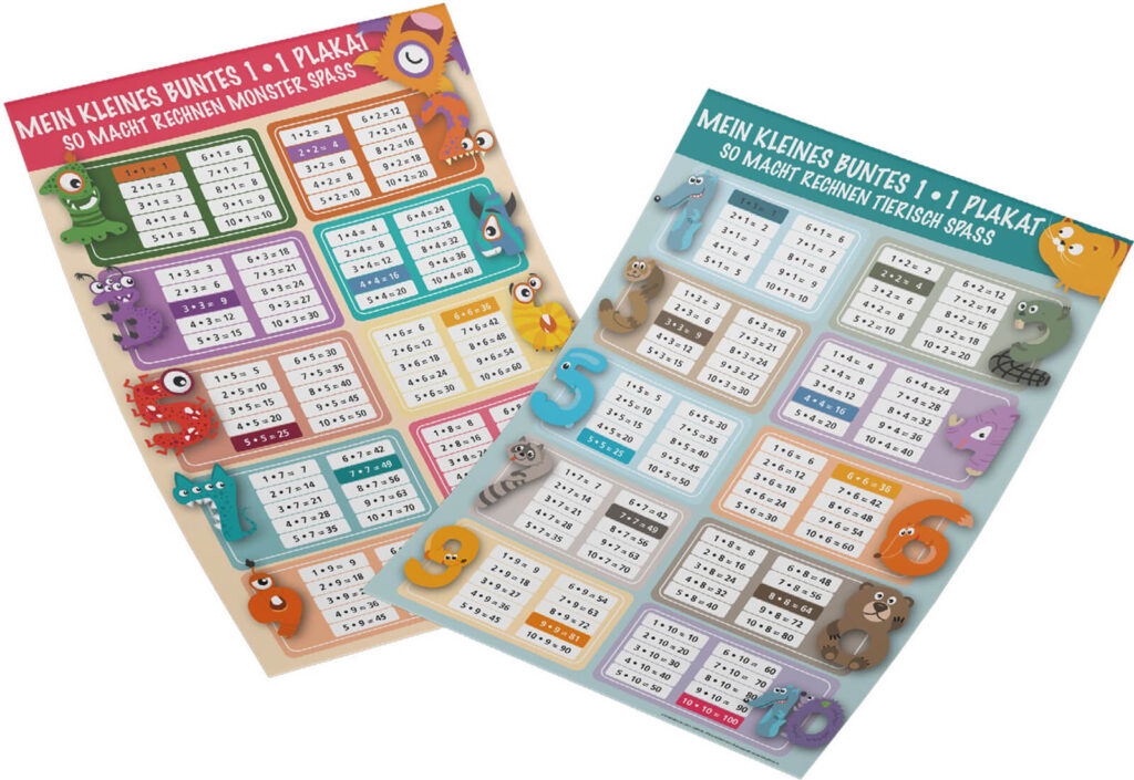 Zweit-, Dritt- und Viertklässler aufgepasst; ab sofort gibt es ein cooles Einmaleins Plakat. Es dekoriert nicht nur die weisse Wand in deinem Zimmer, sondern verschafft mit lustigen Illustrationen grenzenlosen Lernspass. Da du die Zahlenreihen von 1-10 pausenlos anschauen kannst, prägt sich das kleine Einmaleins fast wie von selbst in dein Gedächtnis ein. Übrigens; die Quadratzahlen sind besondere Zahlen, deshalb sind sie farblich hervorgehoben. Hast du Lust diese Lernmethode auszuprobieren?